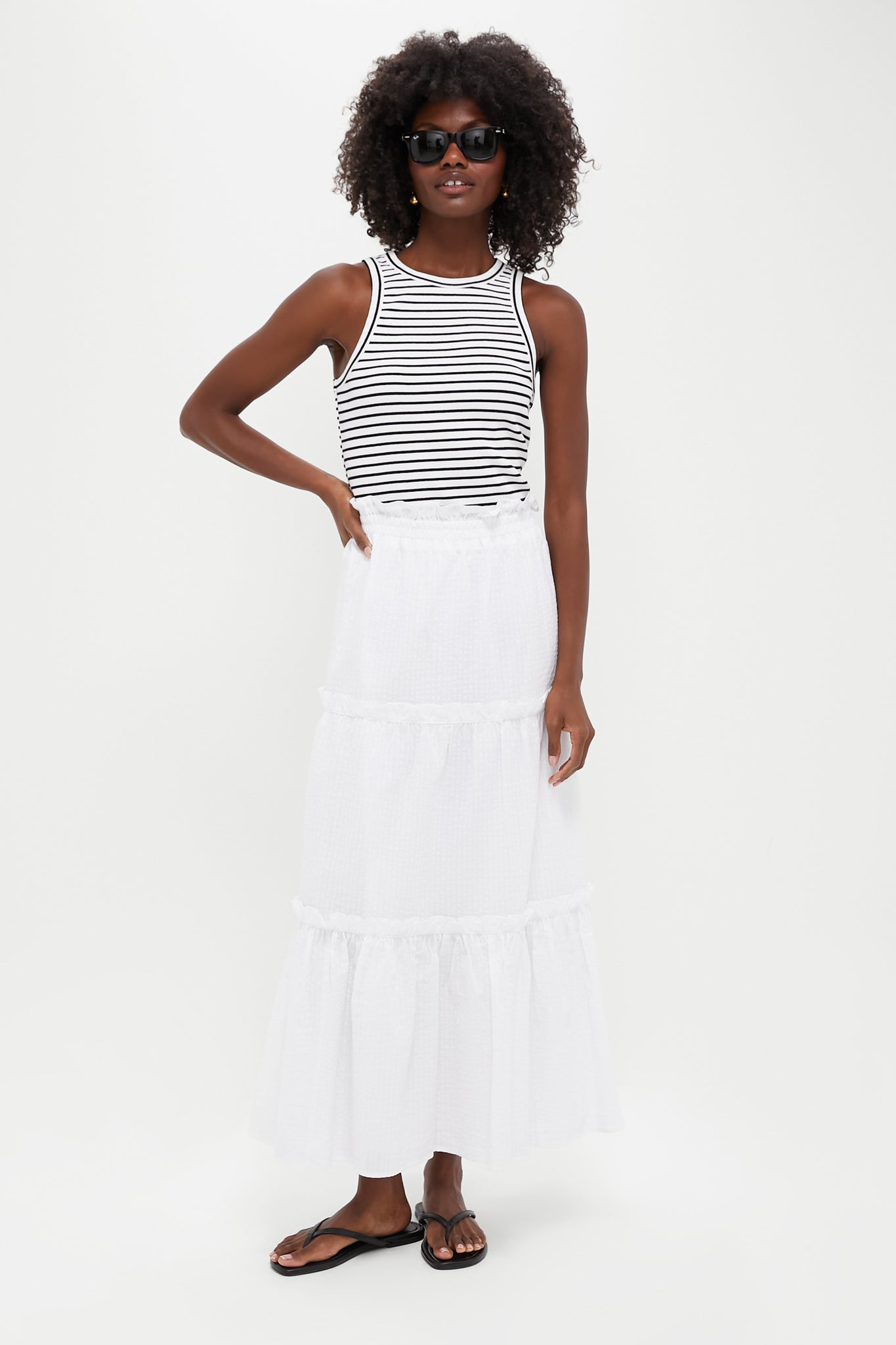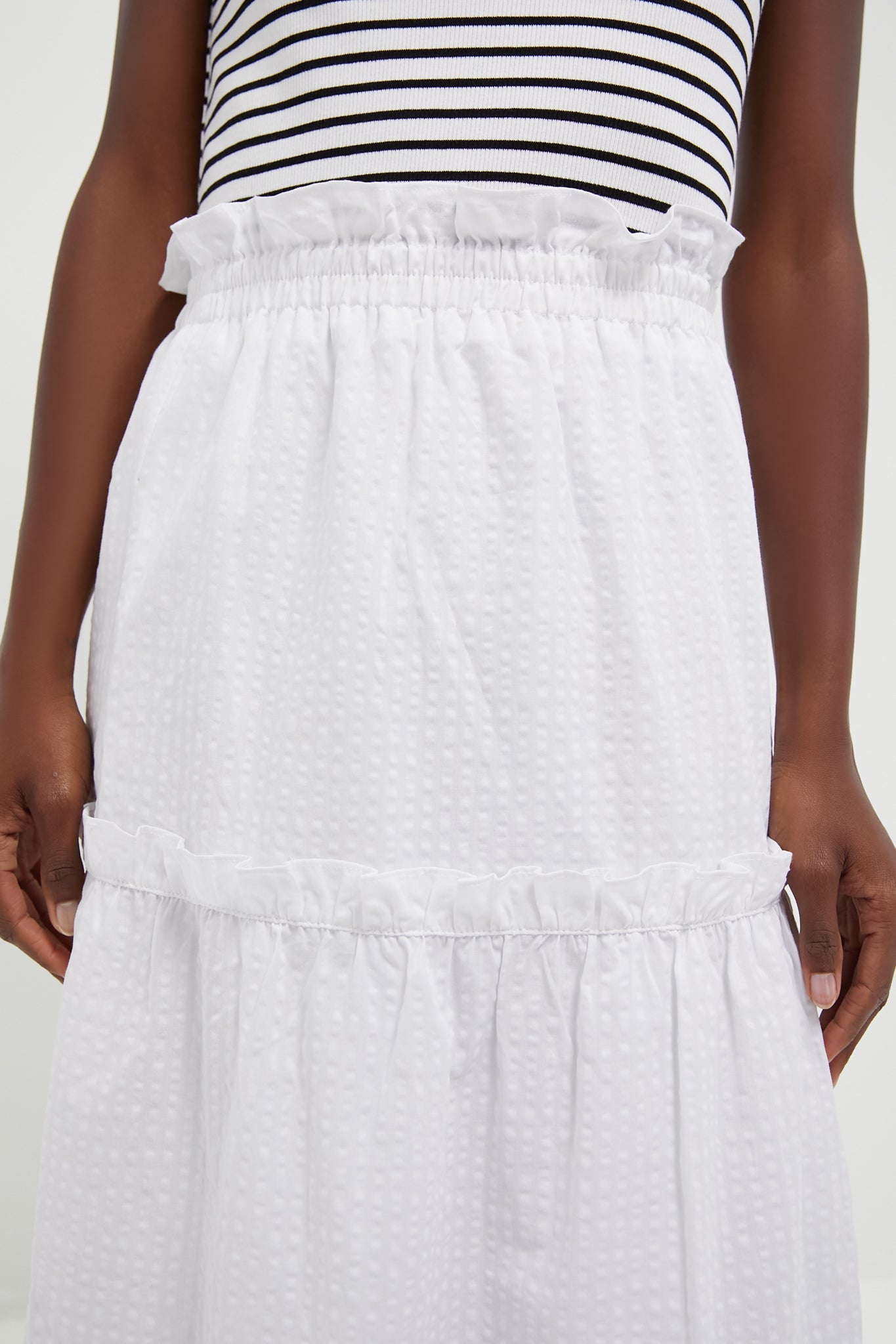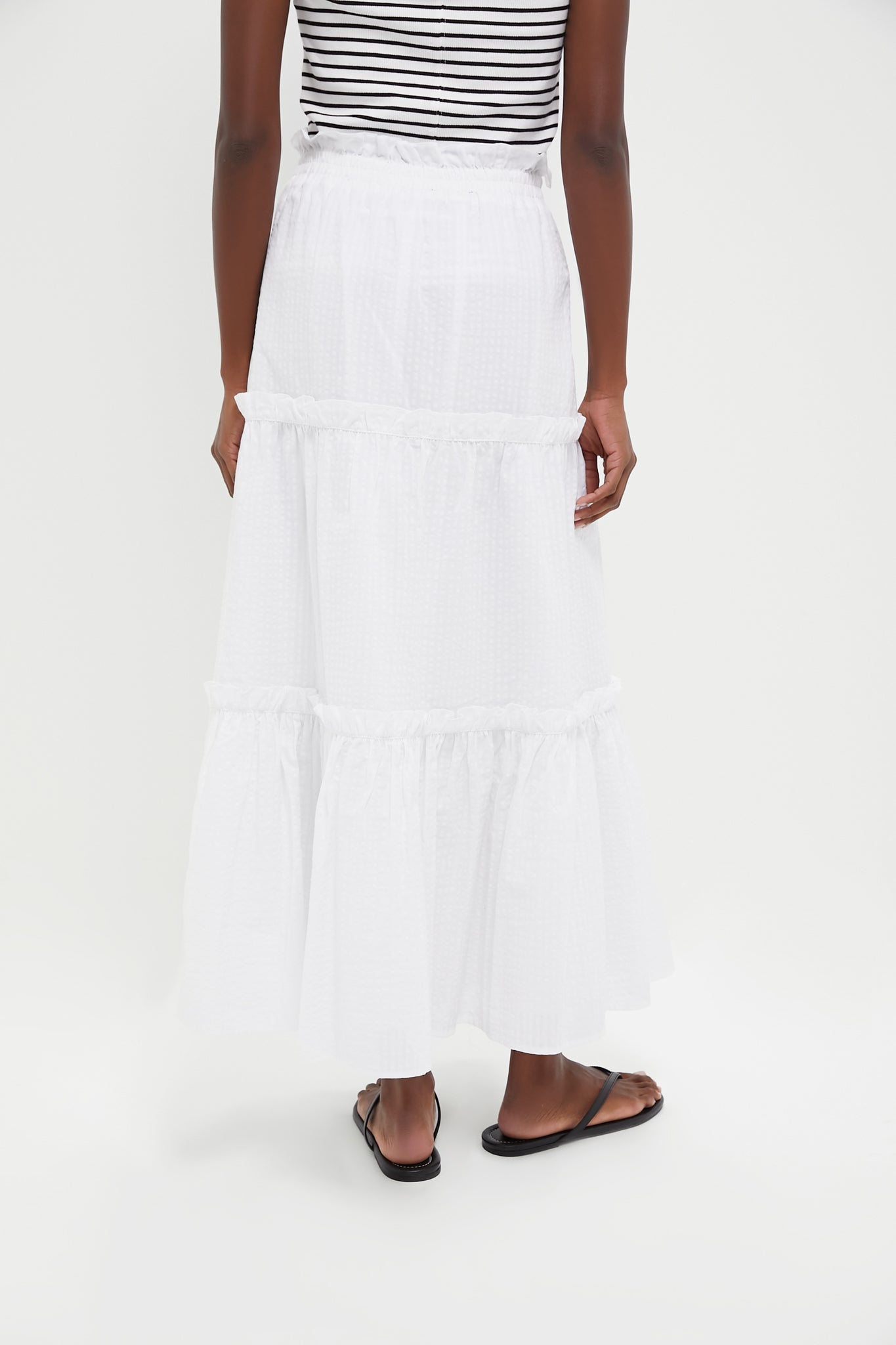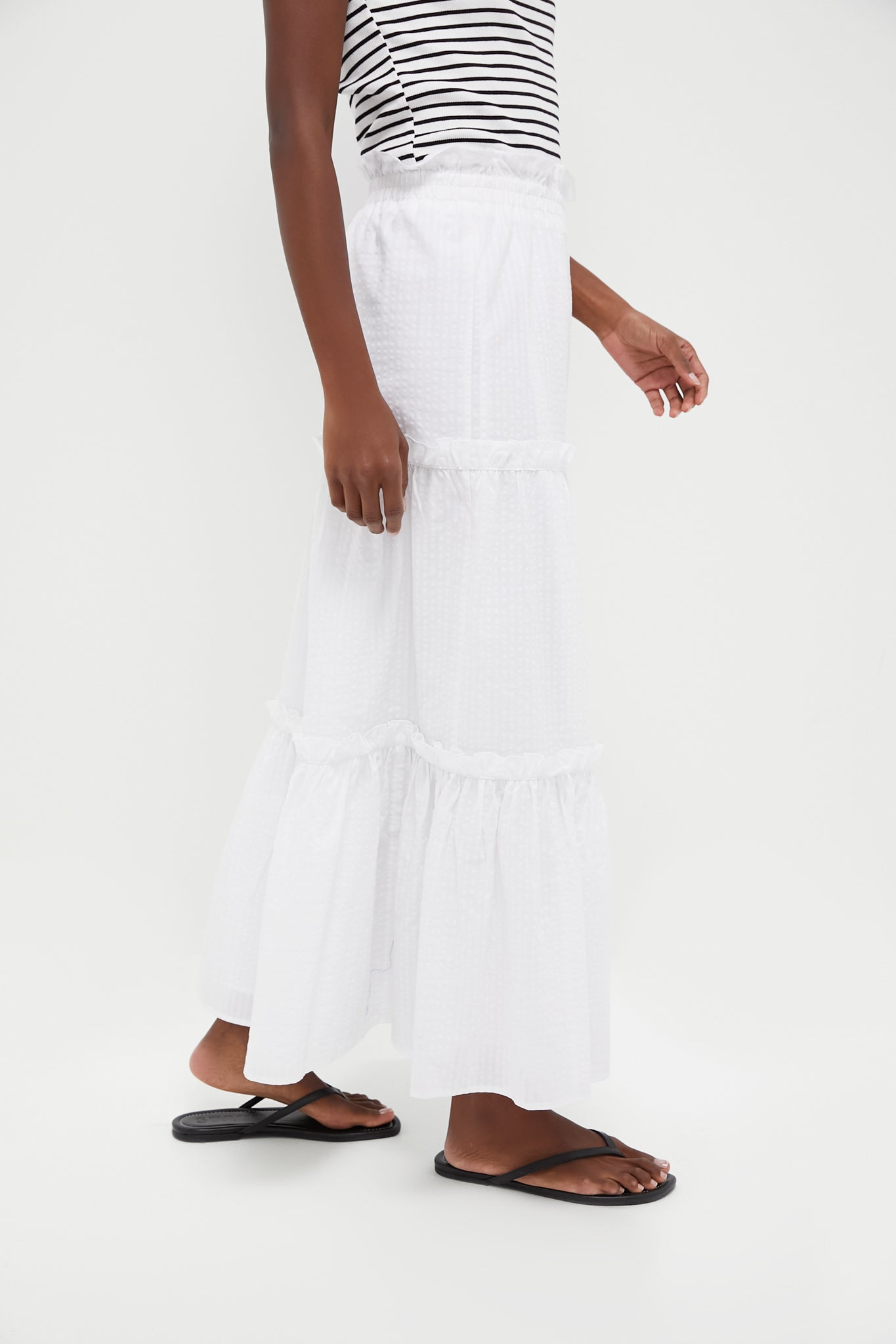 Twirl worthy with its tiered layers and ruffle detailing, the White Seersucker Prado Skirt slips on with minimal effort while bringing maximum style. This pull on maxi is a one step elevation to a casual look while keeping you ultra-chic. Pair with a fitted tank or blouse and sandals, sneakers, or flats!
