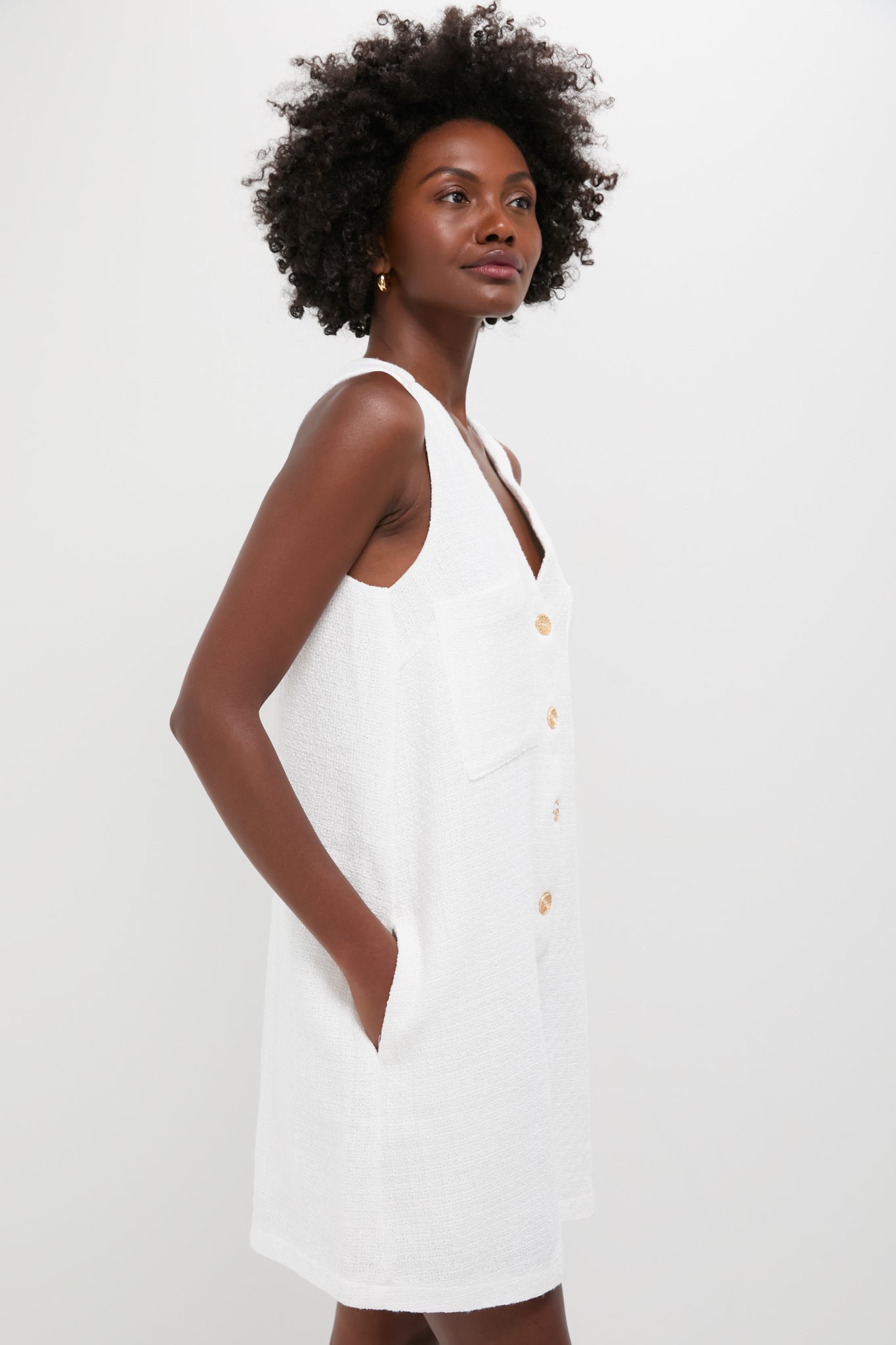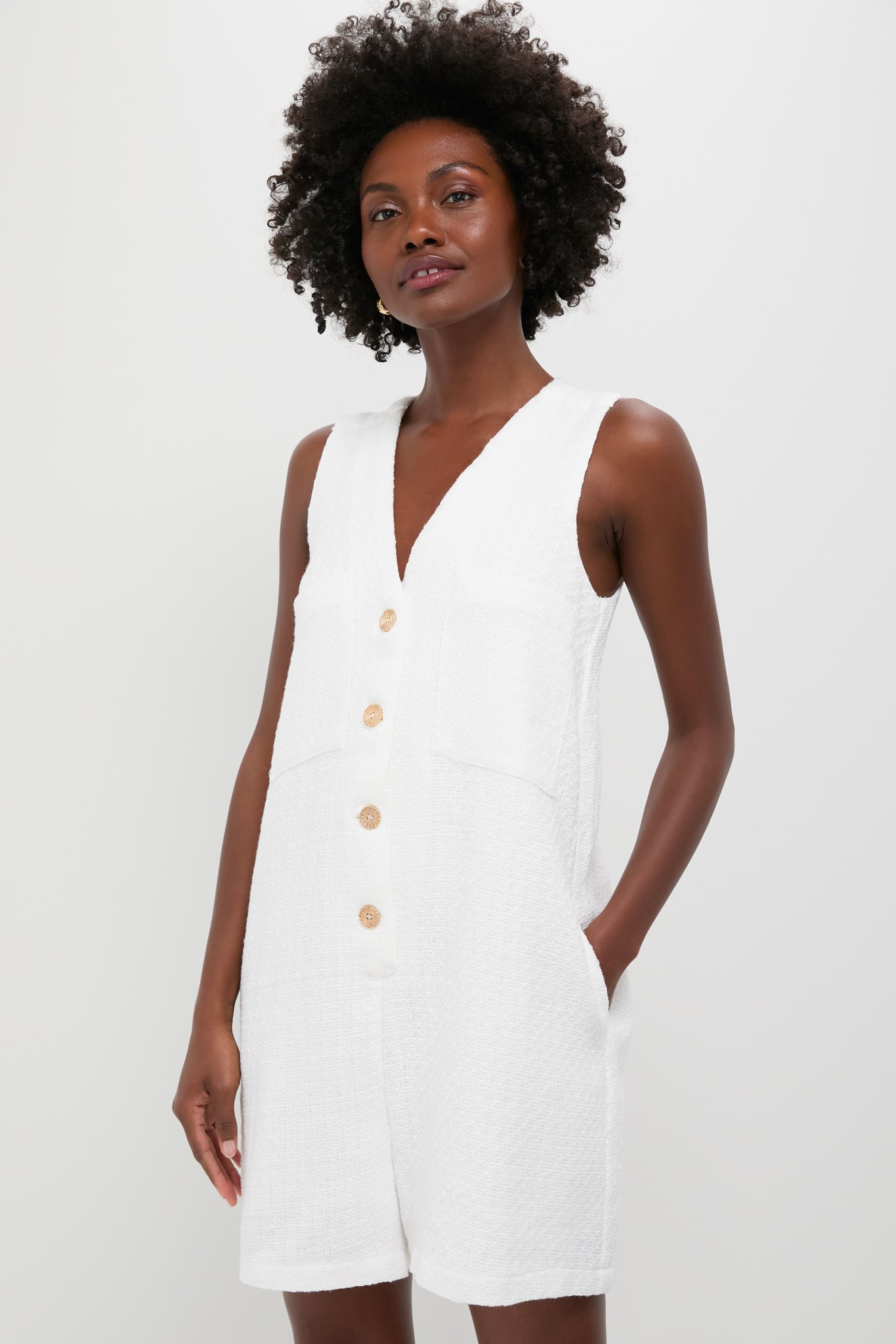 Effortlessly chic, this one-piece is perfect for anything and everything! From brunches and get togethers to happy hours and vacations, this easy yet elevated style has you covered. The White Myla Romper features two front pockets at the chest, gold button detailing for some extra shine, and a textured fabric to create cool contrast. Pair with glitzy flats and bold accessories for glamorous dinners on your next getaway!