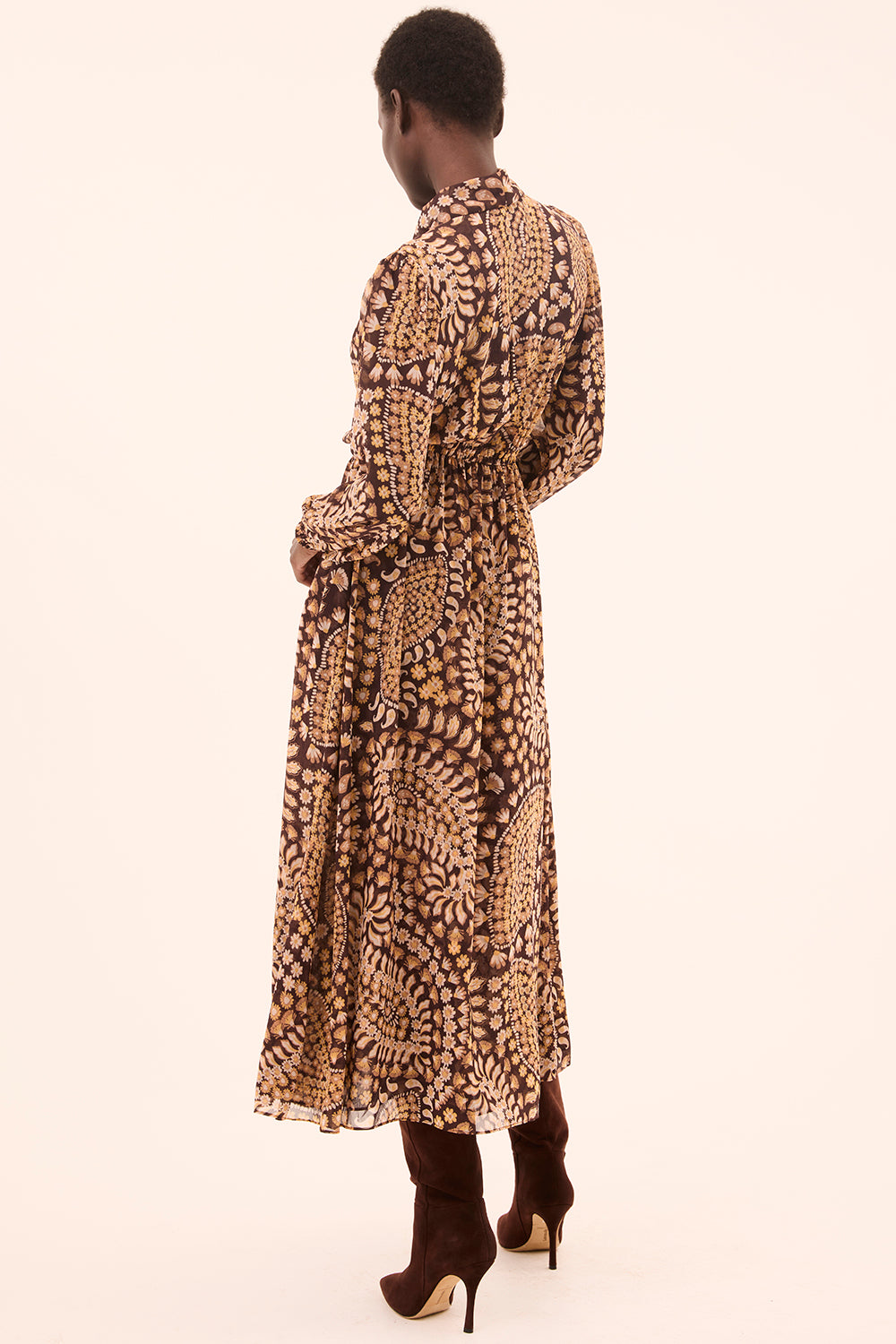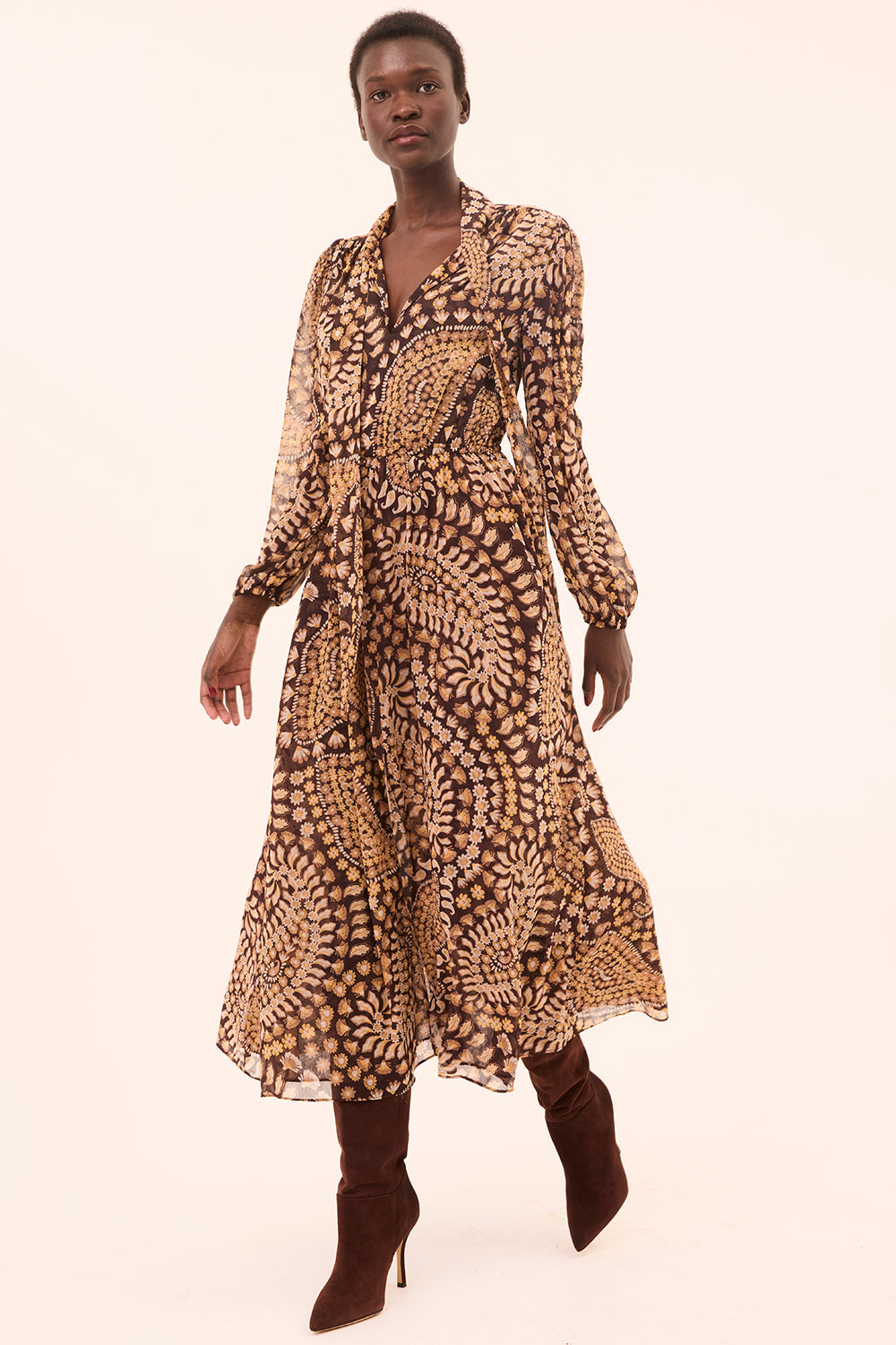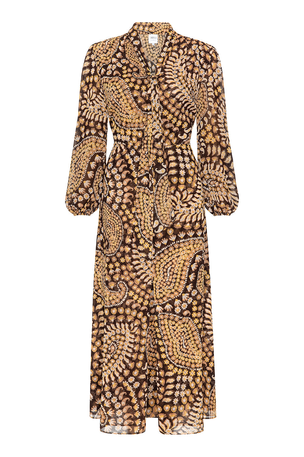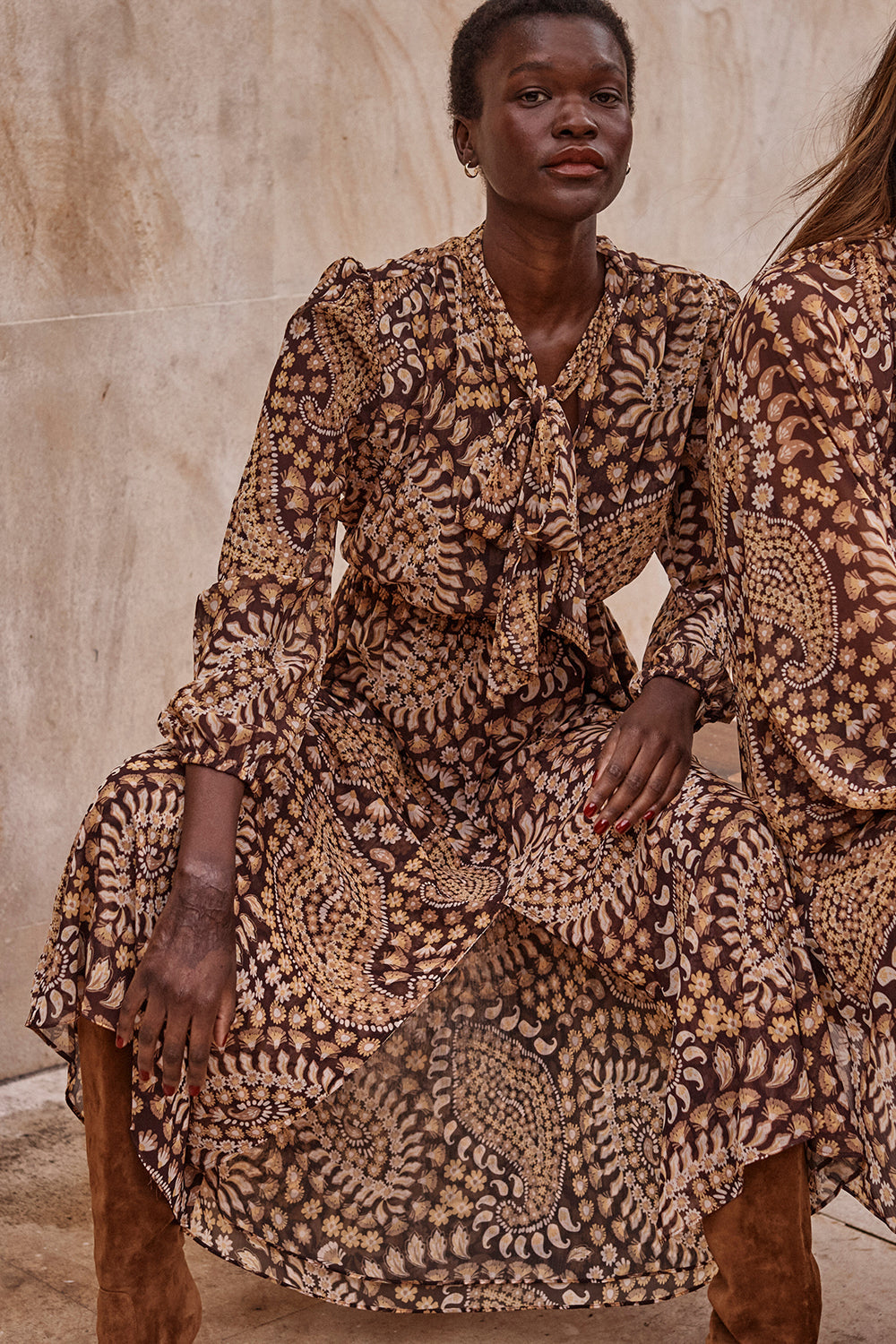 Wilma is a timeless midi dress cut from our autumnal Daisy Paisley print chiffon. Designed with slightly puffed shoulders, long blouson sleeves, and elasticated cuffs, it features a split V-neckline with a pussy-bow tie that can be worn loose or tied. The flowing skirt is double lined with a slit to the knee, while the elasticated waist provides an easy fit. A perfect desk-to-dinner style.