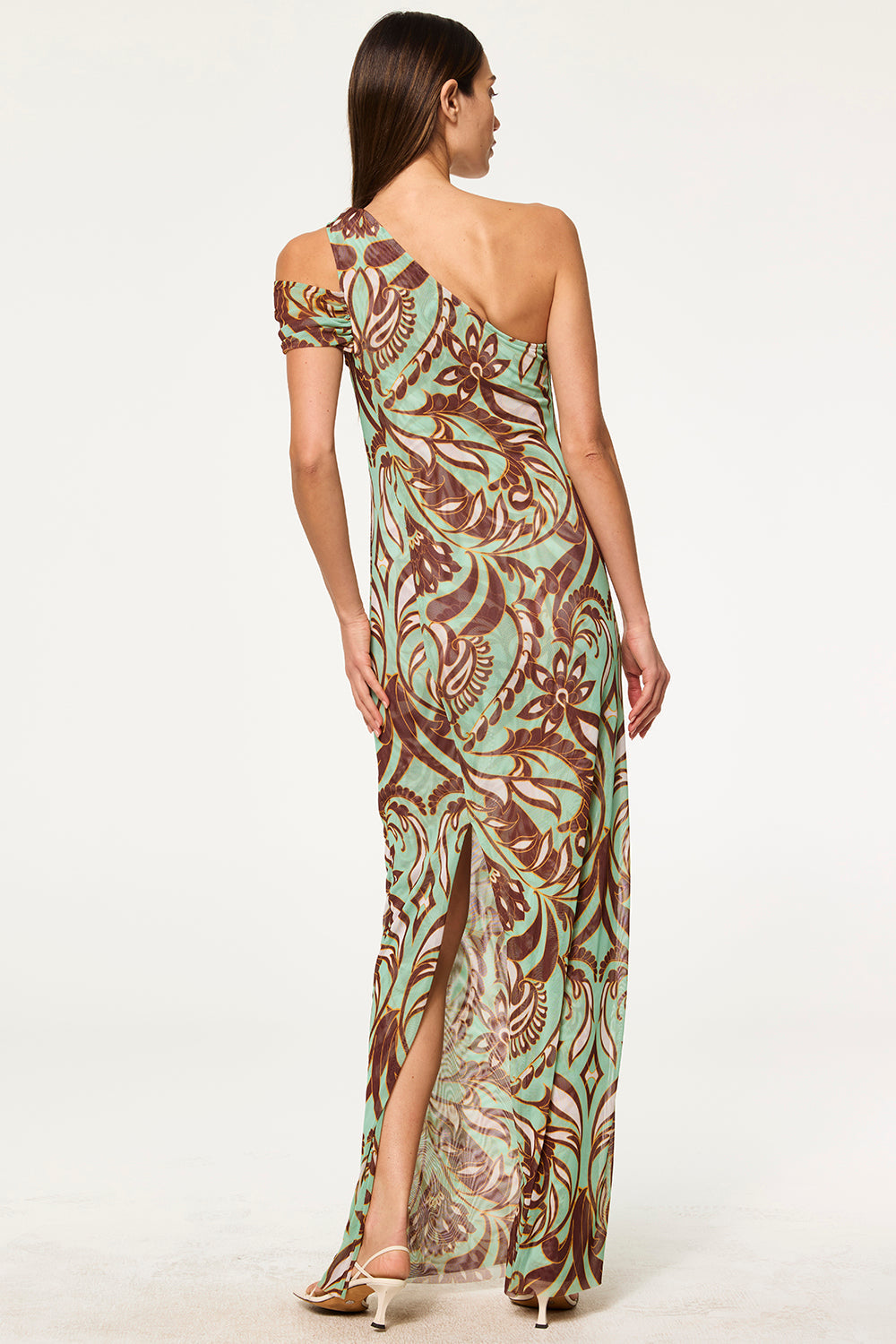 Zelma is an elevated new maxi silhouette cut from our striking Brown Vintage Botanical stretch mesh on a mint ground. This one-shoulder design features a draped peekaboo shoulder detail with gathered ruching, creating soft dimension. Fitted through the bodice and hips, it falls into a straight skirt with a back slit. Double lined and effortlessly chic, Zelma is the perfect pack-and-go piece for a destination wedding or any event on your summer calendar.