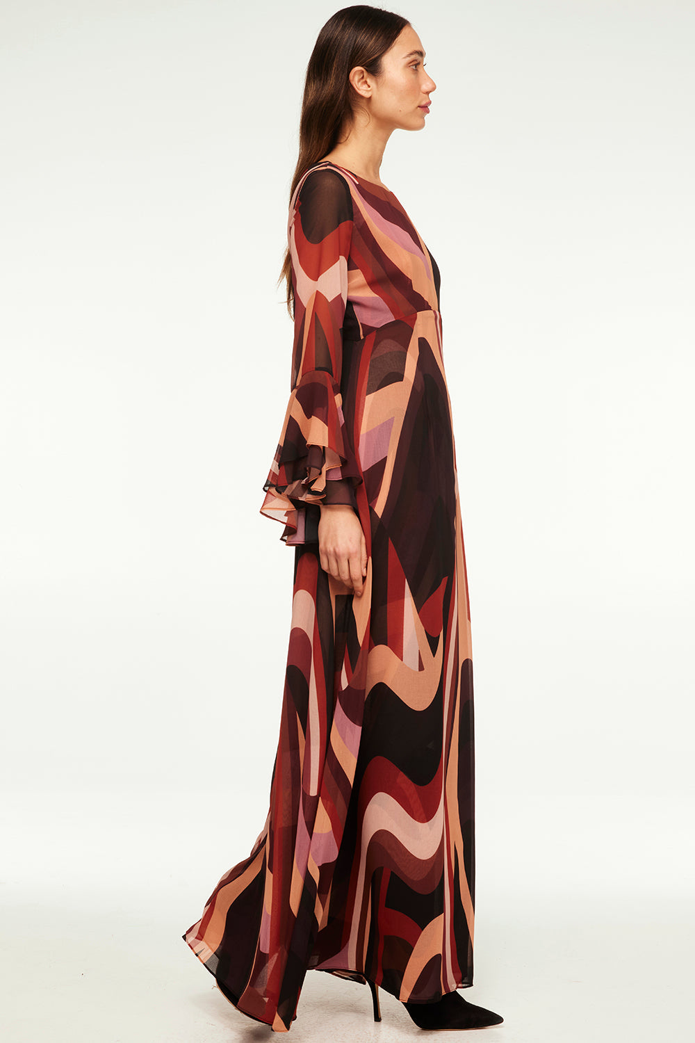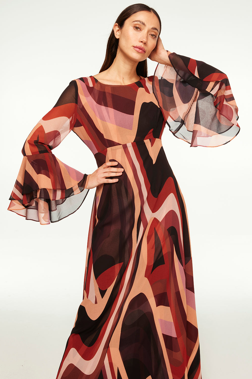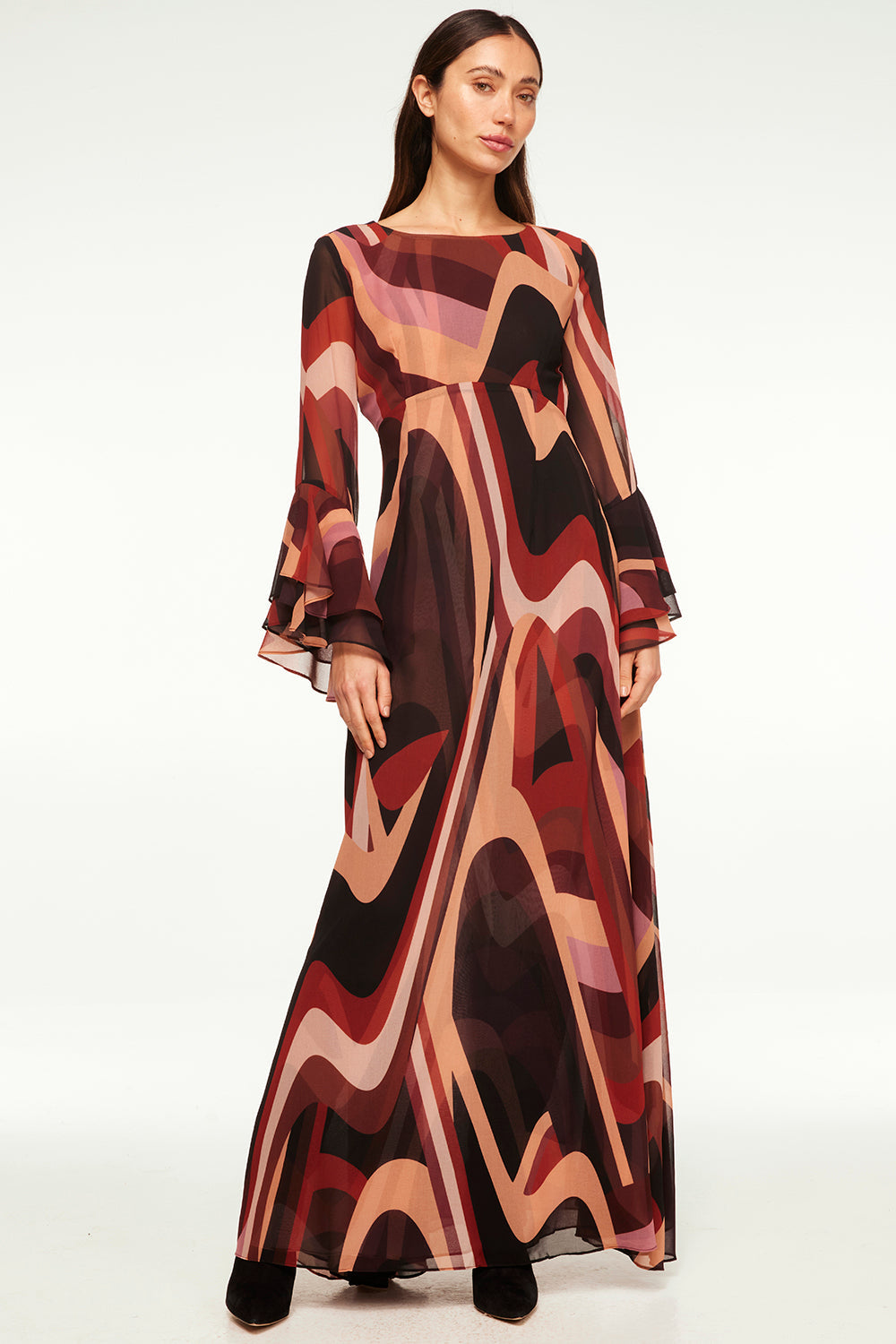 Our newest standout maxi dress is cut from a modern Canyon Stripe printed chiffon and features a bateau neckline, long tiered sleeves and a button keyhole back closure. This vintage-inspired a-line silhouette is double lined and pairs with everything from this season's must-have boots to strappy heels depending on the occasion.