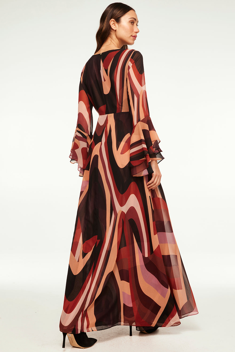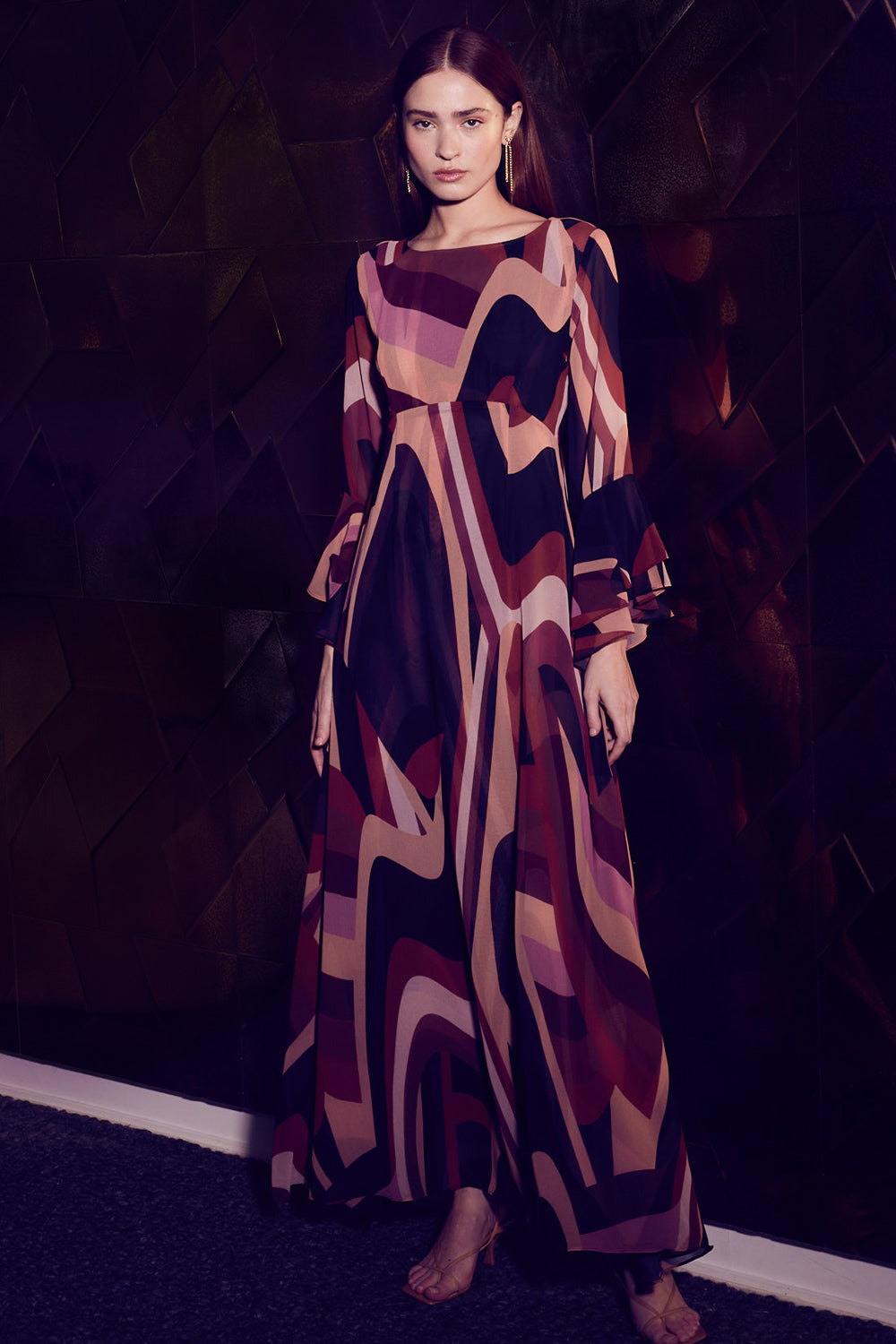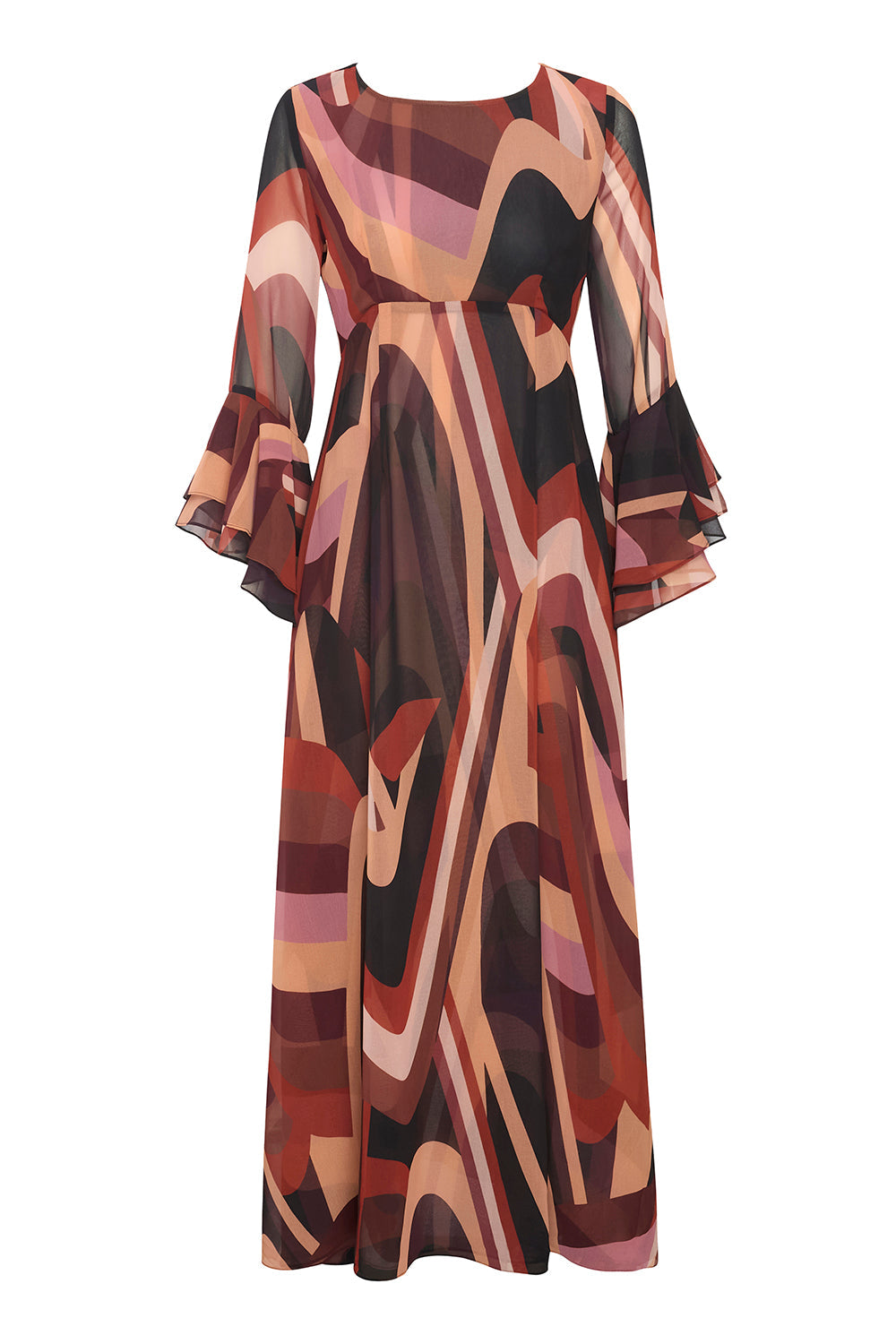 Our newest standout maxi dress is cut from a modern Canyon Stripe printed chiffon and features a bateau neckline, long tiered sleeves and a button keyhole back closure. This vintage-inspired a-line silhouette is double lined and pairs with everything from this season's must-have boots to strappy heels depending on the occasion.