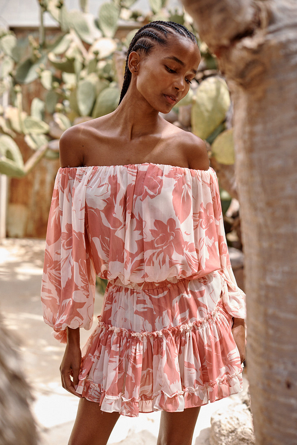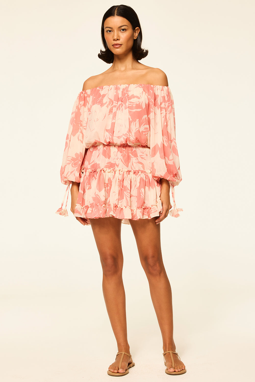 The Zonia dress, a most-loved favorite, returns in our airy Coral Blooms chiffon. This double-lined, off-the-shoulder silhouette features a smocked neckline and elastic waist for a comfortable, flattering fit. Long balloon sleeves are finished with signature petal ties, while delicate ruffle accents add a feminine touch to the tiered skirt. An effortlessly romantic look for any occasion.